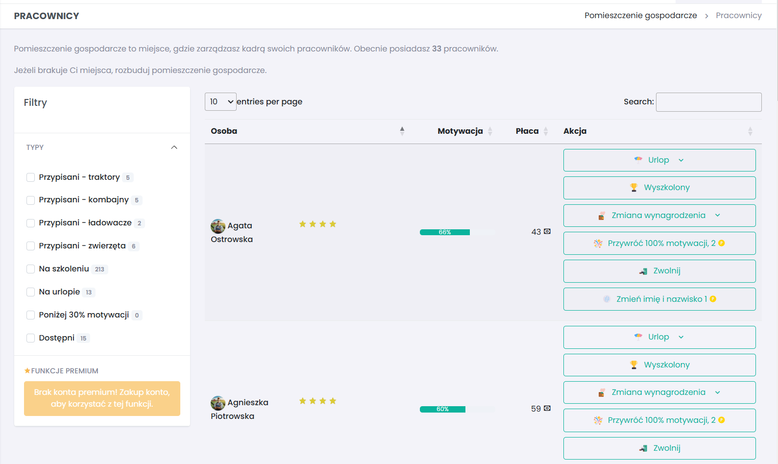 Symulator Farmy Online umożliwia kompleksowe zarządzanie kadrą. Rekrutuj pracowników, ustalaj wynagrodzenia i premie motywacyjne. Planuj urlopy i szkolenia, aby podnieść efektywność Twojego gospodarstwa. Najlepsi pracownicy są kluczem do sukcesu Twojej farmy.